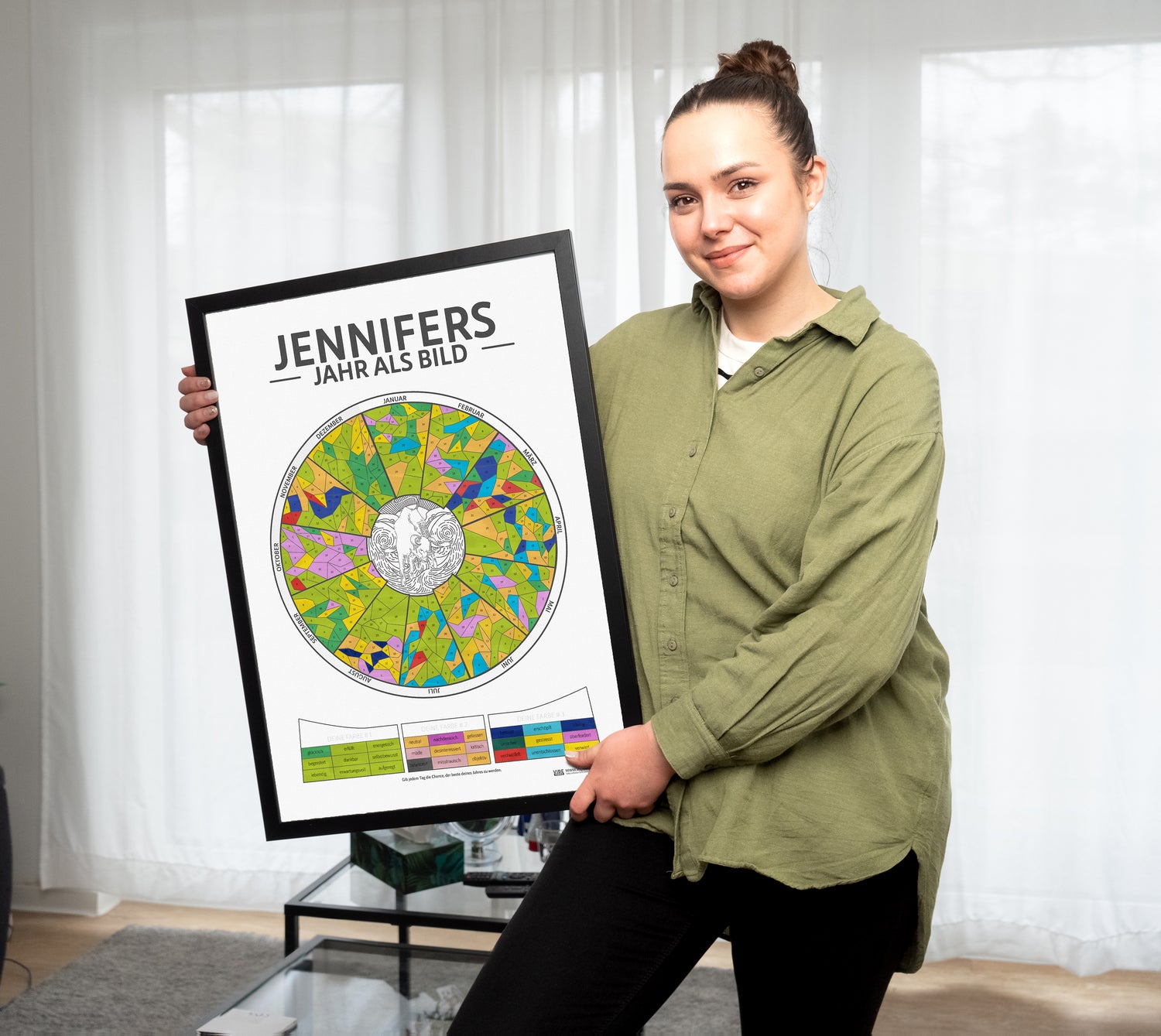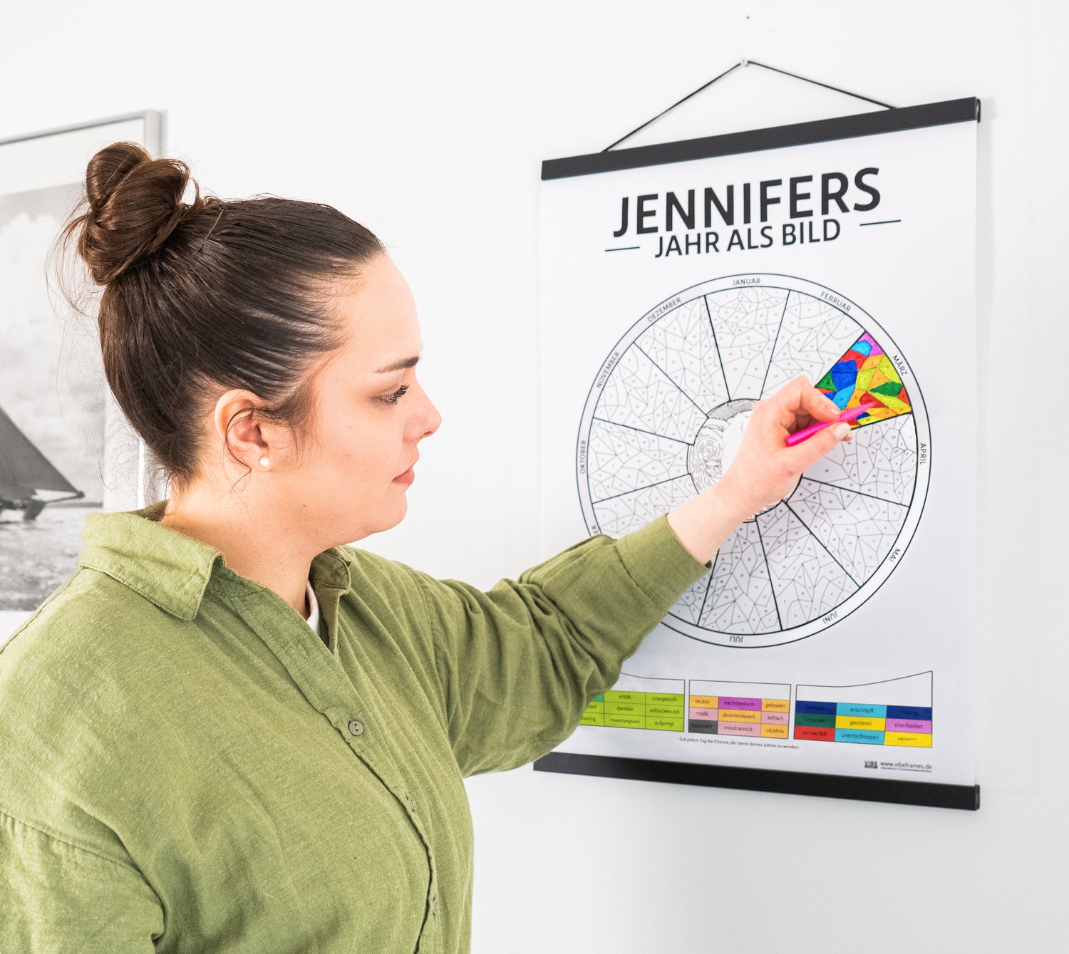 Entweder wirfst du am Ende des Monats oder Jahres, einen Blick auf dein Poster, um deine mentale Stimmung visuell Revue passieren zu lassen, oder du verwendest die psychologische Auswertung für zusätzliche Details.